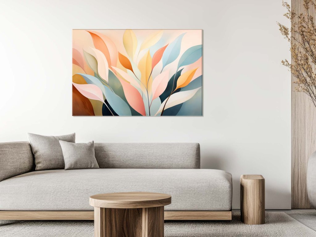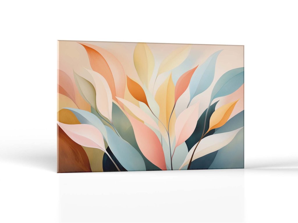 Abstraktné listy v jemných pastelových odtieňoch vytvárajú elegantnú kompozíciu.