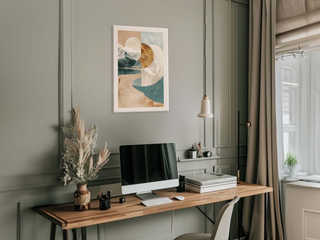 Tento obraz zobrazuje harmonickú kombináciu prírodných prvkov v abstraktnej forme. Na ľavej strane sú realisticky stvárnené hory a rieka, ktoré prechádzajú do abstraktných tvarov na pravej strane. Dominantný kruh symbolizuje mesiac, ktorý spája všetky prvky dohromady a vytvára pocit rovnováhy a pokoja.