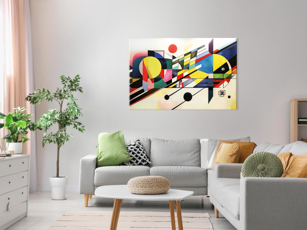Tento abstraktný obraz prezentuje bohatú paletu farieb a rôznych geometrických tvarov, ktoré sa navzájom prelínajú a vytvárajú harmonickú kompozíciu. Každý tvar a farba v obraze prispievajú k celkovej dynamike a vizuálnemu zážitku.