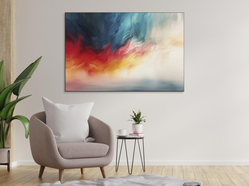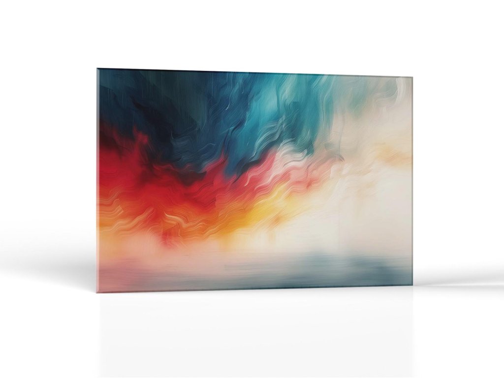 Obraz predstavuje abstraktné zobrazenie plynúcich vĺn oceánu, ktoré sú oživené záplavou farieb z východu slnka. Vizuálna symfónia teplých a chladných odtieňov vytvára dynamický, ale harmonický vizuálny zážitok. Mäkké prechody medzi červenými, žltými a modrými tónmi vytvárajú pocit tepla a pokojnej sily, ktorá pozorovateľa zahalí do stavu uvoľnenia a kontemplácie.