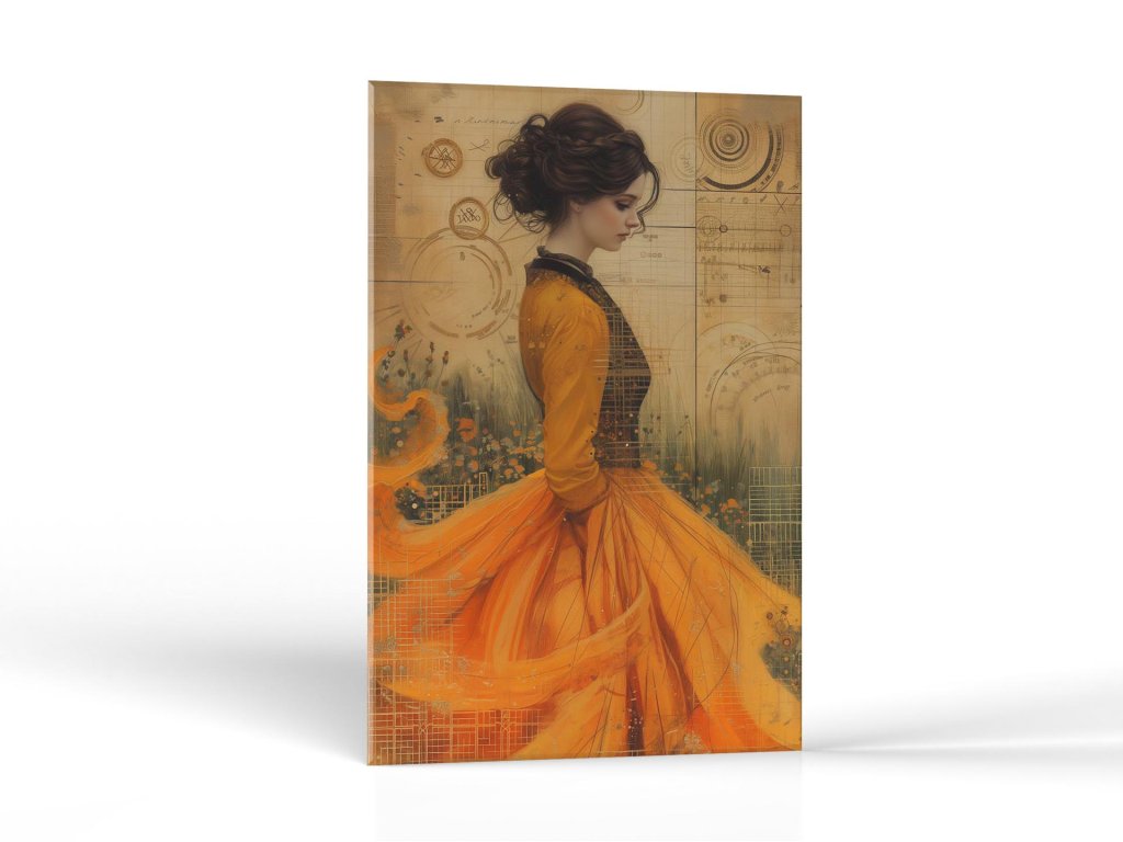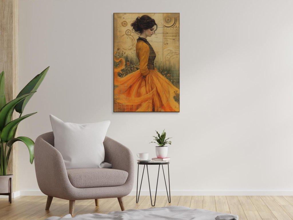 Profilový portrét mladej ženy oblečenej v oranžovom šate s rozpracovanými geometrickými a technickými vzormi v pozadí. Jej vlasy sú zdobené a skrotené do elegantného účesu, a šaty majú zdobený korzet. Tento obraz kombinuje prvky modernizmu a klasického portrétu, vytvára dojem klasickej krásy v kontraste s modernými prvkami.