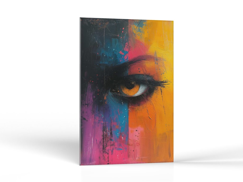 Toto umelecké dielo zobrazuje realisticky vyobrazené ľudské oko, ktoré je kontrastne umiestnené na abstraktnom pozadí s výraznými škvrnami a škrtancami. Hra svetla a tieňov na očnom viečku dodáva hĺbku a intenzitu pohľadu, zatiaľ čo živé farby na pozadí od oranžovej cez modrú až po ružovú vytvárajú silný vizuálny dopad.