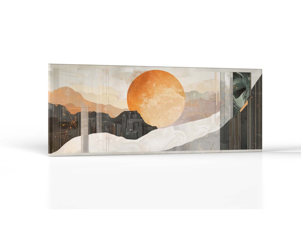 Tento obraz spája prírodné prvky a mestskú krajinu v harmónii, kde veľké, zlaté slnko dominuje nad abstraktnou scenériou. Mestská architektúra je zobrazená v tmavých odtieňoch, čím kontrastuje so svetlými farbami oblohy a okolitej krajiny. Geometrické línie a textúry dotvárajú obraz, ktorý navodzuje atmosféru pokoja a rovnováhy medzi mestom a prírodou.