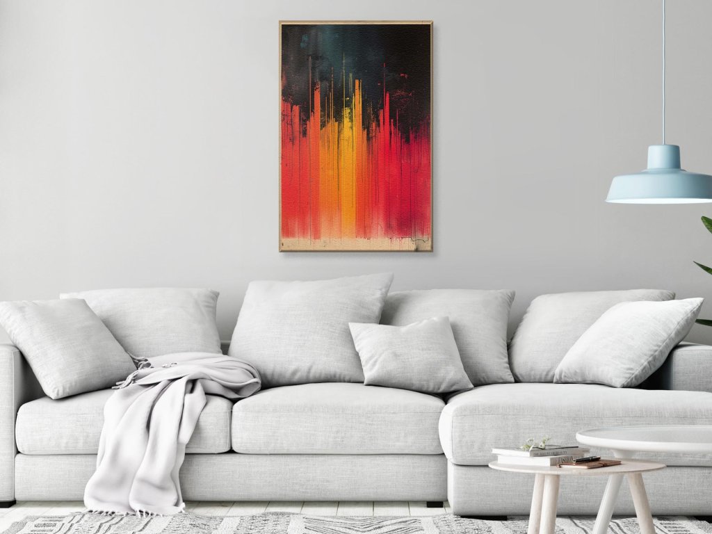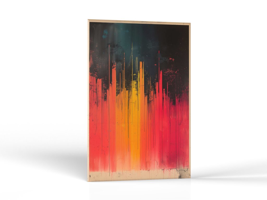Obraz zobrazuje silné vertikálne línie, ktoré prechádzajú z tmavej čiernej na vrchu k intenzívnym červeným a oranžovým odtieňom pri spodku, imitujúc prúdenie lávy alebo plamene. Hravé kontrasty a prúdy farieb vytvárajú pocit pohybu a tepla, zatiaľ čo kvapkanie farby na spodnej časti dáva dielu textúru a hĺbku. Táto kompozícia vyniká svojou energiou a dynamikou, ktorá evokuje obrazy ohňa a jeho transformačnej sily.