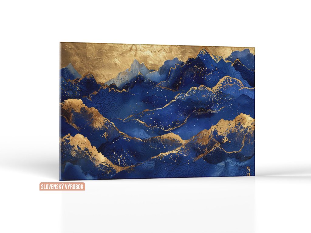 Na tomto umeleckom diele je zachytená dynamika horskej krajiny s majestátnymi vrcholkami, ktoré sú zdôraznené zlatou farbou. Modré tóny a zlaté linky navodzujú dojem pohľadu na horskú reťaz obklopenú nočnou oblohou. Výtvarná technika dáva tomuto obrazu hlbokú textúru a vizuálne zaujímavosť.