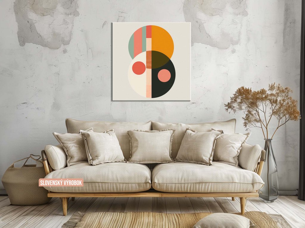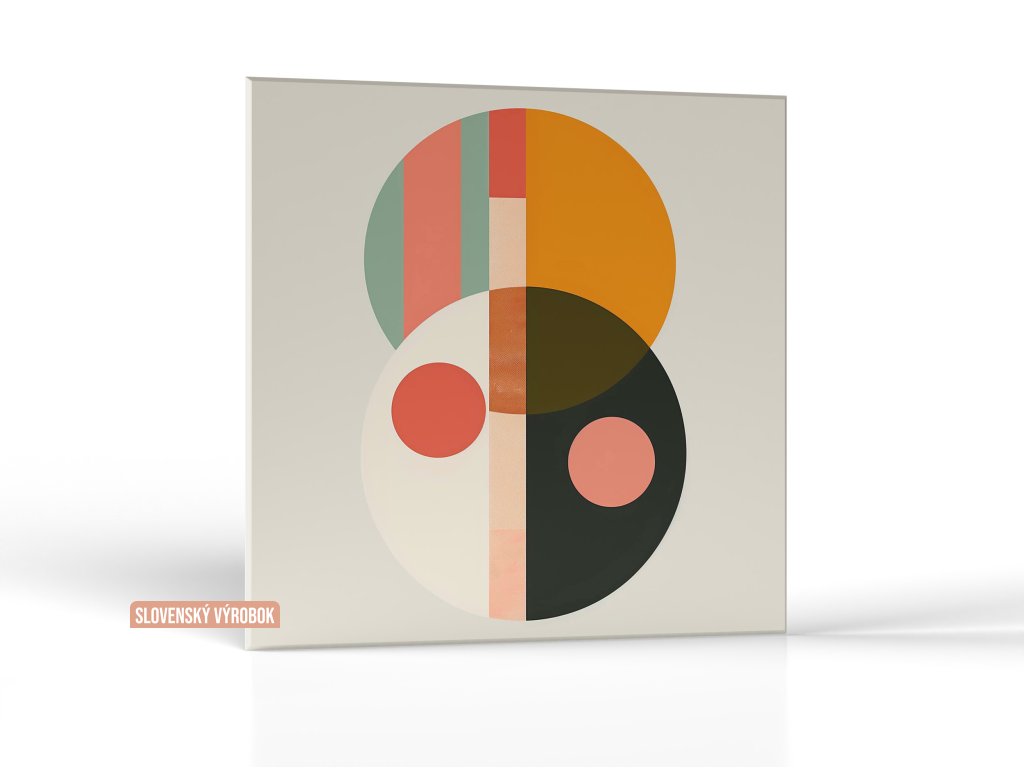 Tento obraz predstavuje zloženie rôznych geometrických tvarov ako kruhy a obdĺžniky, zoradené v esteticky príjemný vzor. Farebná paleta je mixom teplých odtieňov oranžovej a červenej a studených tónov zelenej a čiernej. Celkový dizajn je harmonický, no zároveň ponúka vizuálnu dynamiku prostredníctvom kontrastu farieb a rozloženia prvkov.