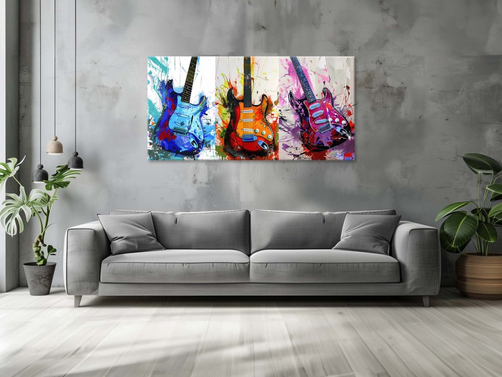 Tento obraz zachytáva tri elektrické gitary, každú v inej farbe, v plnom prostredí explózie farieb a pohybu. Modrá, oranžová a fialová gitara sú umiestnené na pozadí, ktoré pripomínajú výbuch farieb a energie, čo symbolizuje silu a vášeň hudby.