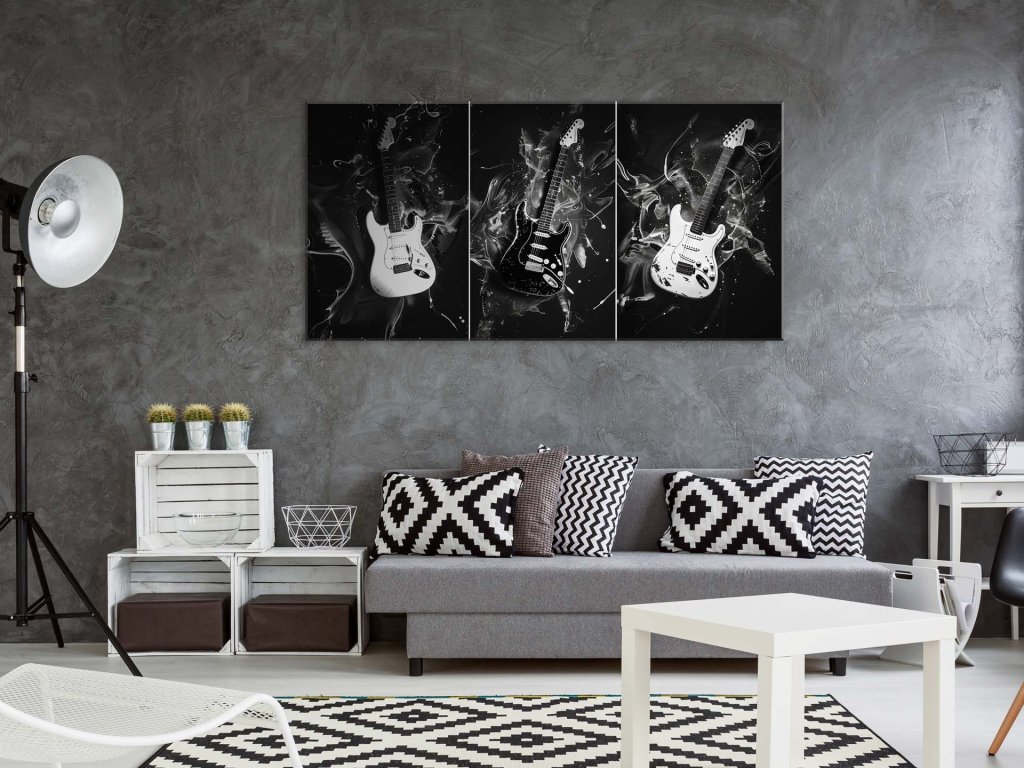 Tento obraz zobrazuje tri elektrické gitary, každú v odlišnom farebnom prevedení - bielu, čiernu a bielu s čiernymi škvrnami - na pozadí plnom dynamických abstraktných tvarov a línií. Každá gitara vyniká vlastným štýlom, pričom ich čisté línie a kontrastné farby vytvárajú silný vizuálny dojem.