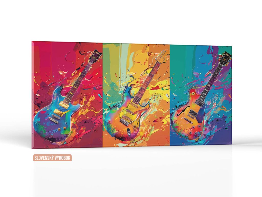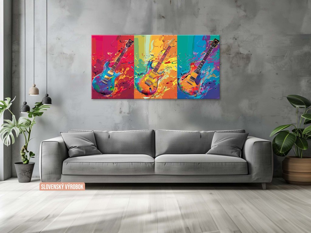 Tento obraz zobrazuje tri elektrické gitary, každá v inej dynamickej polohe, obklopená živými a pestrými farbami, ktoré pripomínajú výbuch farieb a energie. Každá gitara má svoj vlastný jedinečný farebný vzor, čím vytvára harmonický, ale zároveň výrazný kontrast na pozadí. Tento vizuálny podmanivý obraz symbolizuje energiu, kreativitu a vášeň, ktorá je spojená s hudbou.