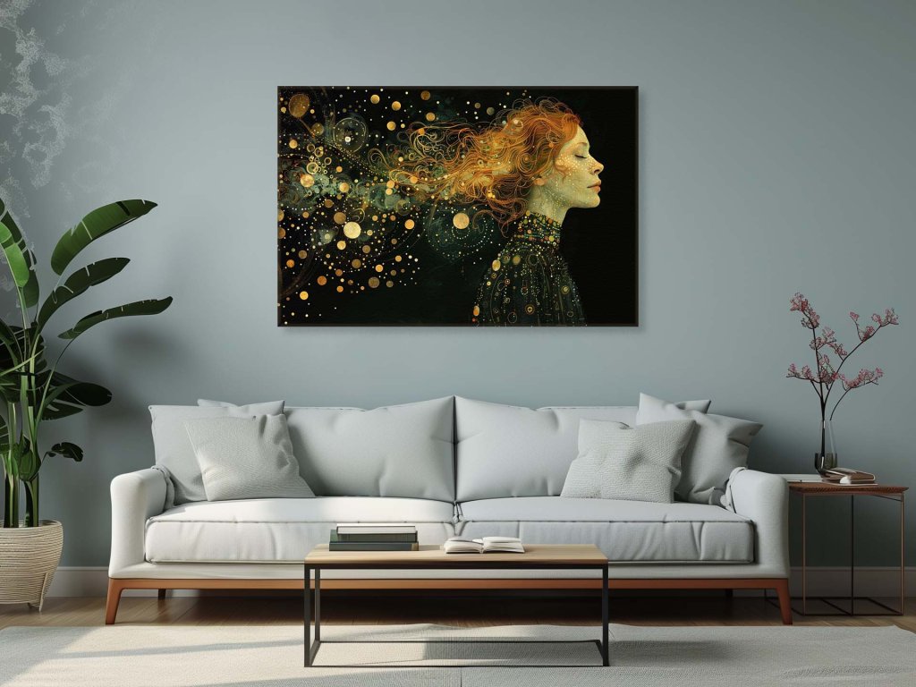 Obraz ukazuje ženu z profilu, ktorej rozpustené vlasy prechádzajú do vzoru zlatých hviezd, vytvárajúc ilúziu nočnej oblohy. Jej temný odev sa zlieva s tmavým pozadím, kde jednotlivé svetelné body zodpovedajú nočnej oblohe. Žena je zobrazená v pokoji, s očami zavretými, akoby bola jedno s okolitým vesmírom.