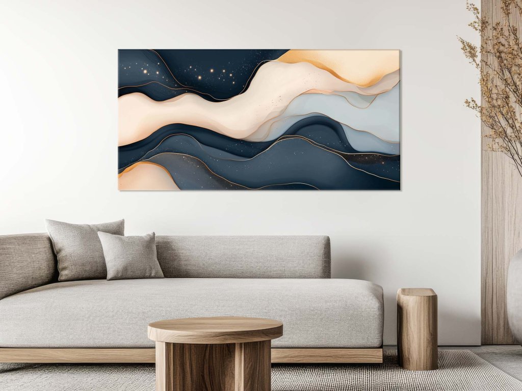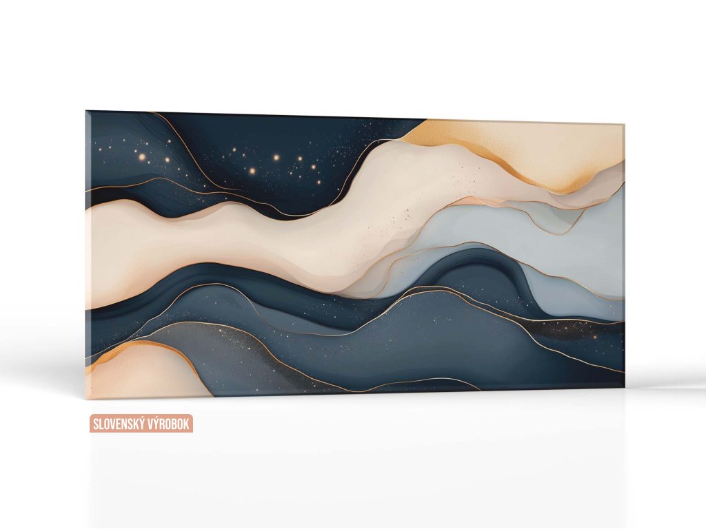 Obraz znázorňuje plynulé vrstvy vo farebnej palete tmavomodrej, zlatej a krémovej, ktoré sa vlnia ako krajina snov či galaktická rieka. Jemné svetielka a zlaté čiary evokujú hviezdy a vesmírnu energiu, ktorá ticho prúdi naprieč obrazom. Kompozícia pôsobí hypnoticky a zároveň ukľudňujúco, ako vizuálna meditácia o pohybe, priestore a večnosti.
