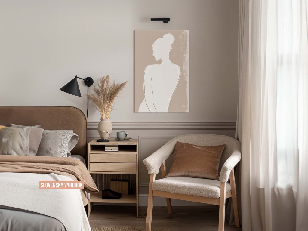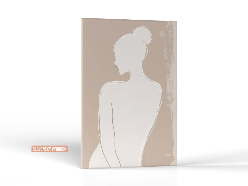 Obraz zobrazuje elegantnú a jemnú siluetu ženy, vytvorenú čistými a jednoduchými líniami na jemne béžovom pozadí. Táto minimalistická kompozícia zdôrazňuje krásu a eleganciu ženského tela, pričom jej tvar a proporcie sú vyjadrené s maximálnou jednoduchosťou. Celkový dojem obrazu je pokojný a sofistikovaný, čím vnáša do priestoru harmóniu a jemnosť.