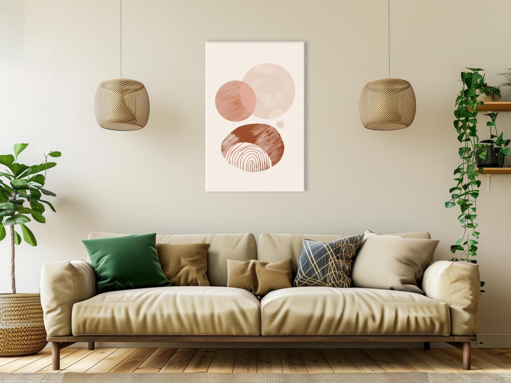 Tento obraz predstavuje elegantnú kompozíciu abstraktných kruhov v jemných béžových a oranžových odtieňoch. Každý kruh má svoj vlastný charakter a textúru, čím vytvára harmonický celok. Celkový dojem je upokojujúci a príjemný, čo robí tento obraz ideálnym pre moderné a minimalistické interiéry.