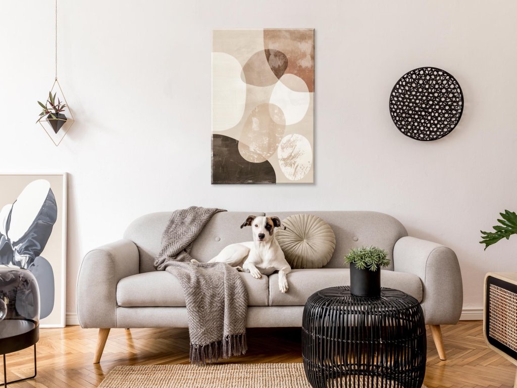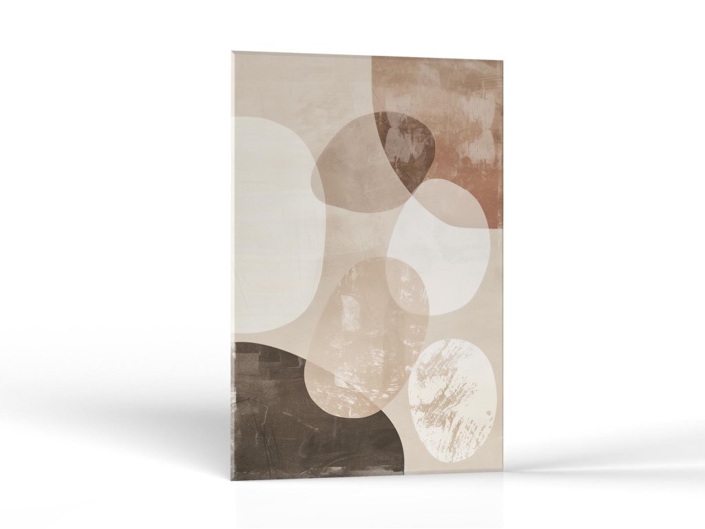 Tento obraz zobrazuje kombináciu jemných béžových a hnedých odtieňov, ktoré vytvárajú harmonickú kompozíciu geometrických tvarov. Prekrývajúce sa ovály a nepravidelné tvary prinášajú pocit jemnosti a elegancie. Obraz je vizuálne príťažlivý svojou jednoduchou, no sofistikovanou farebnou paletou, ktorá navodzuje pocit pokoja a rovnováhy.