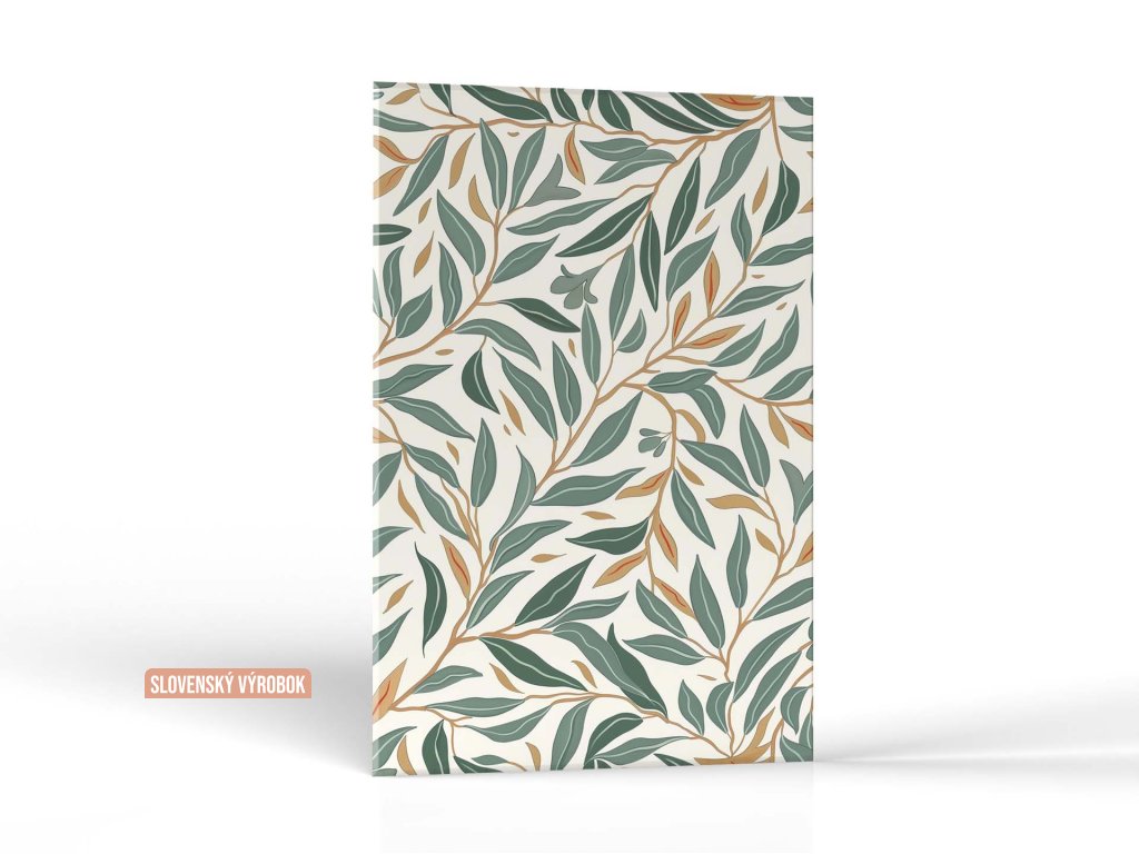 Abstraktné zobrazenie lístia v jemných zelených a zlatých odtieňoch.