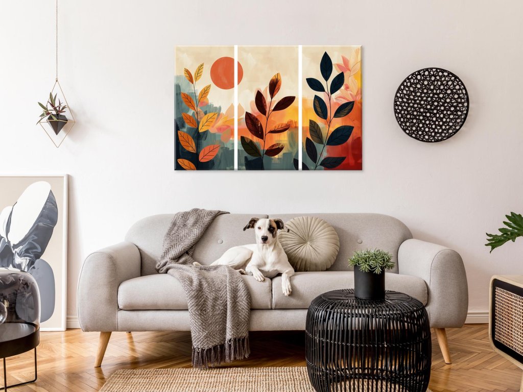 Tento obraz predstavuje tri abstraktné panely, ktoré zachytávajú krásu jesene prostredníctvom farebných listov a teplých tónov. Na každom paneli sú zobrazené rôzne farby listov, od oranžovej cez hnedú až po tmavo modrú, čo vytvára harmonický prechod farieb. Pozadie obrazu je jemné a rozmazané, čo dodáva celkovému dojmu pokoj a harmóniu.