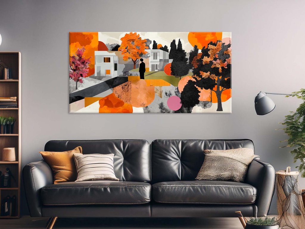 Tento obraz zachytáva jesennú atmosféru pomocou teplých tónov oranžovej a žltej, ktoré kontrastujú s čiernobielymi prvkami mesta. Stromy s farebnými listami a minimalistické budovy spolu tvoria surrealistickú krajinu, v ktorej sa postava stráca v hlbokých myšlienkach. Kombinácia textúr a farieb podčiarkuje hĺbku obrazu a vytvára dynamickú, no zároveň introspektívnu scénu.
