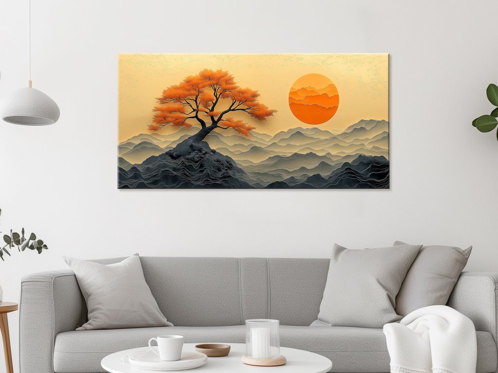 Tento obraz zobrazuje majestátny strom, ktorý sa elegantne nakláňa nad pokojnou krajinou plnou vlnitých hôr. Slnko na pozadí, zahalené v teplých odtieňoch oranžovej, vytvára atmosféru pokojných jesenných večerov. Jemné detaily hôr a kontrastné farby stromu pridávajú obrazu hĺbku a pocit nadčasového pokoja.