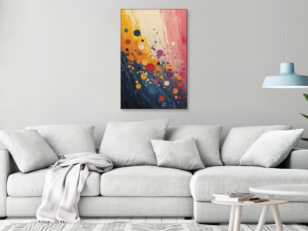 Tento obraz je plný energie a pohybu, zobrazených pomocou žiarivých kvapiek v širokom spektre farieb od oranžovej po tmavomodrú. Dynamika a nepravidelnosť farebných bodiek a škvŕn vytvára dojem spontánnosti a živosti.