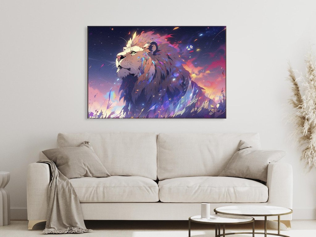 Na obraze je zobrazený majestátny lev pozorujúci oblohu, s hravými abstraktnými prvkami a farbami, ktoré vytvárajú efekt kozmického prostredia. Lev je predstavený v poloprofilu a jeho srsť zdobia pestrofarebné odtiene, ktoré sa rozplynú v okolí. Pozadie obrazu evokuje dojem vesmírneho nekonečna s rozmanitými svetelnými efektami a hviezdami.