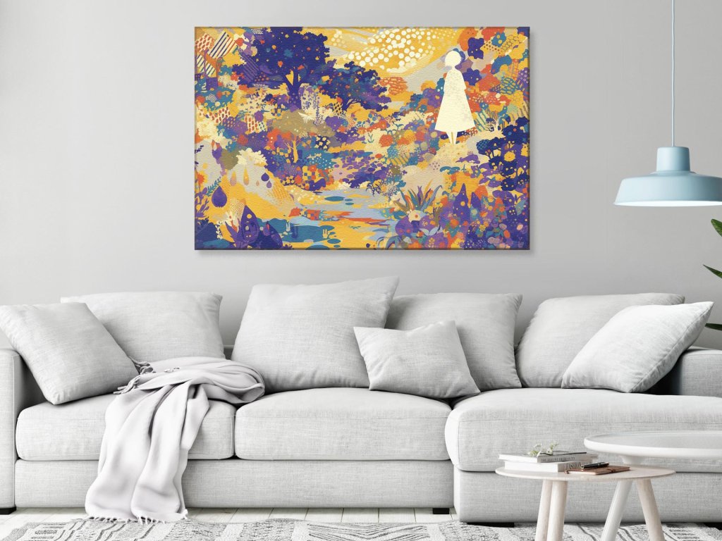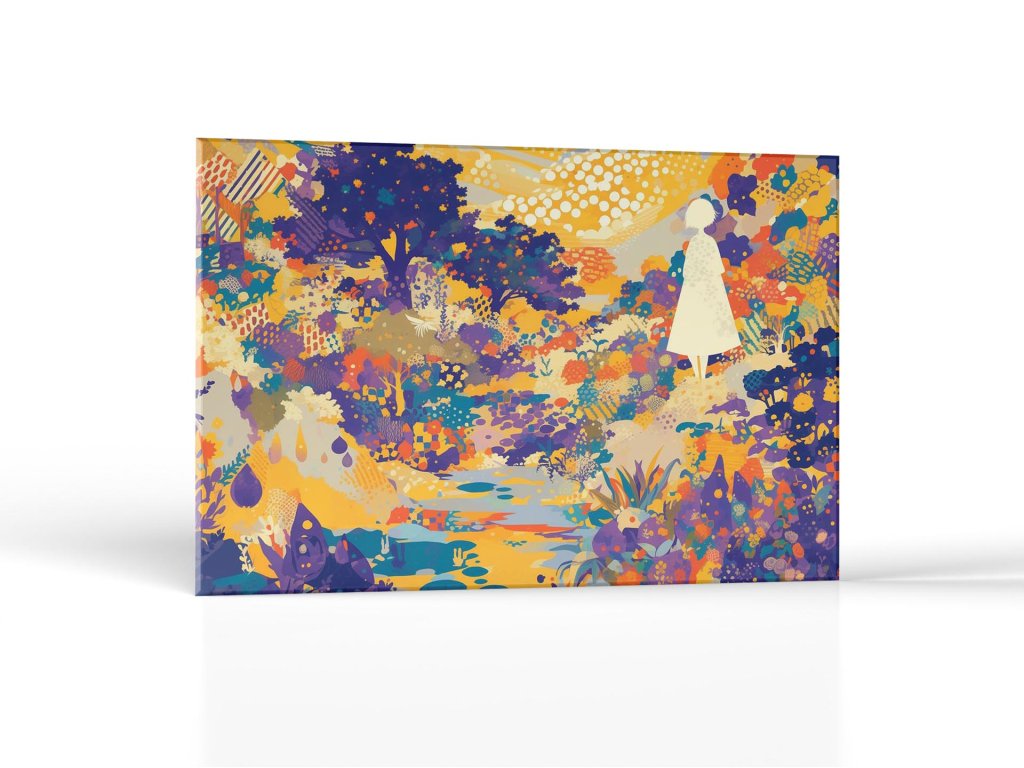 Obraz predstavuje bohatú, farebnú krajinu, ktorá sa zdá byť zložená z rôznych vzorov a textúr, naznačujúc kvety, stromy a vodu v abstraktnej forme. V pravej časti obrazu je zobrazená postava v bielom šate pozorujúca túto farebnú scénu. Celková kompozícia je plná života a dynamiky, čo divákovi umožňuje cítiť sa ako súčasť tohto snového sveta.