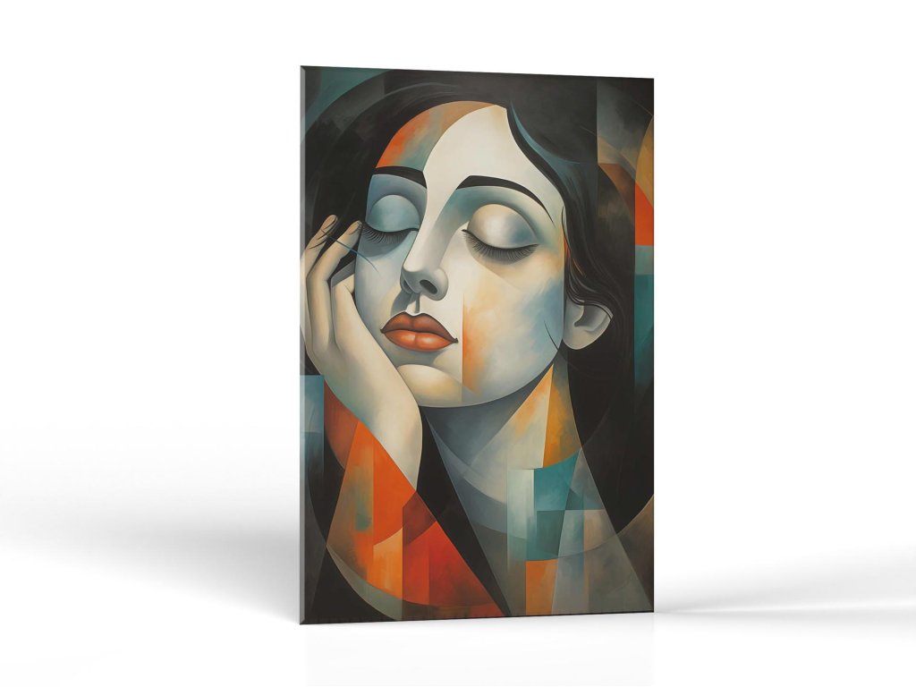 Obraz zobrazuje ženskú tvár v štýle kubizmu, kde rôzne uhly a geometrické tvary vytvárajú jedinečný vizuálny efekt. Výrazné oči a pery sú zvýraznené, zatiaľ čo farebná paleta od čiernej až po oranžovú dodáva dielu hĺbku a teplotu. Tvár na obraze vyvoláva pocit ticha a zamyslenia, čo divákovi umožňuje vlastnú interpretáciu emócií zobrazených na plátne.