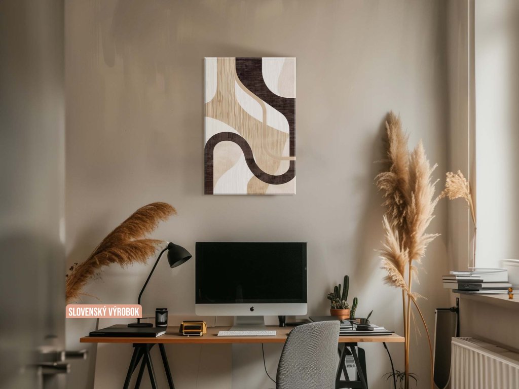 Tento abstraktný obraz zobrazuje sofistikovanú kompozíciu prepletených kriviek a textúr, ktoré vytvárajú harmonický vizuálny zážitok. Použité farby sú prevažne neutrálnych tónov, čo dodáva dielu eleganciu a univerzálnosť. Obraz je vhodný do moderného interiéru, kde môže slúžiť ako výrazný dekoratívny prvok, ktorý upúta pozornosť a zároveň pôsobí upokojujúco.