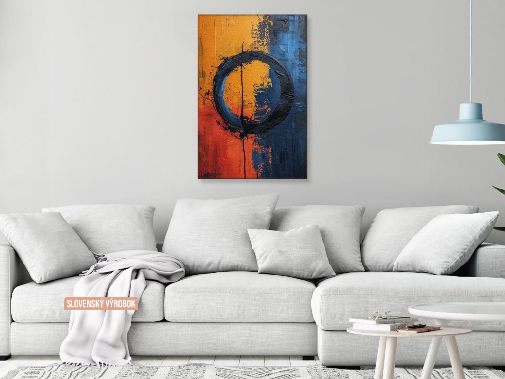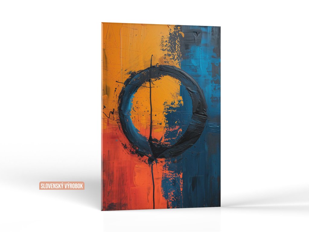 Tento abstraktný maľovaný obraz predstavuje živé oranžové a modré farby, ktoré sa prelínajú a vytvárajú centrálne umiestnený kruh. Prvky kvapiek a striekancov dodávajú kompozícii dynamiku a hĺbku. Kontrastné farby a hrubé vrstvy farby vytvárajú silný vizuálny dojem.