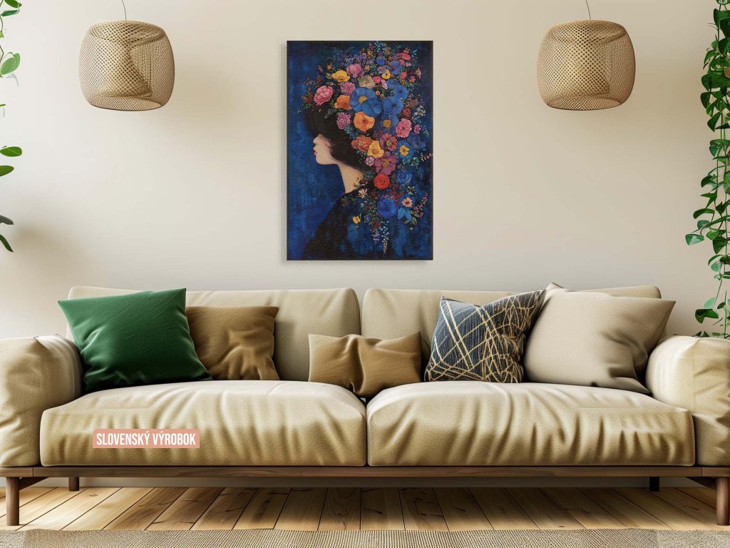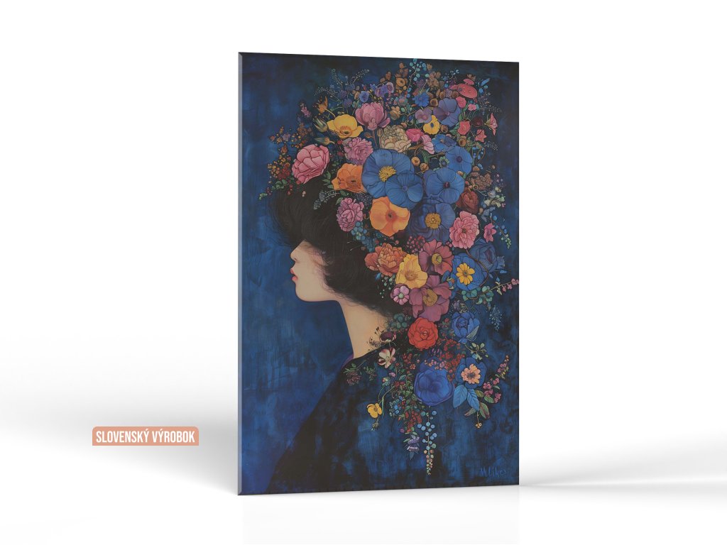 Portrét ženy, ktorý transformuje jej vlasy do bohato ilustrovanej záhrady plnej rôznofarebných kvetov na dramatickom tmavomodrom pozadí, evokuje tajomstvo a krásu prírody. Živé farby kvetov kontrastujú s tmavým pozadím, čo zdôrazňuje ich detail a rozmanitosť. Obraz je oslavou ženskosti a spojenia s prírodou, a jeho detaily a farby sú zobrazené s jemným a precíznym štýlom.