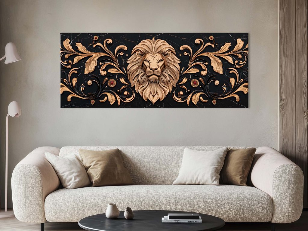 Tento obraz zachytáva symbolickú silu a majestátnosť leva ako kráľa zvierat, ktorý dominuje kompozícii. Okolo levovej hlavy sa rozprestierajú zlatisté ornamenty, ktoré zvýrazňujú jeho dôstojnosť a silu, zatiaľ čo drahokamy dodávajú obrazu nádych luxusu. Tmavé pozadie ešte viac podčiarkuje kontrast medzi jemnými detailmi ornamentov a robustným výrazom leva, čím vzniká pôsobivý, vyvážený celok.