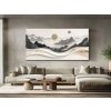 Na tomto umeleckom diele je zobrazená minimalistická a pokojná krajina v jemných odtieňoch šedej, čiernej a zlata, ktorá sa mieša s organickými tvarmi a líniami. Dominantný mesiac a jeho menší spoločník na oblohe pridávajú kompozícii mystickú atmosféru. Geometrické a abstraktné prvky vytvárajú moderný a štylizovaný dojem, ktorý evokuje pocit ticha a kontemplácie.