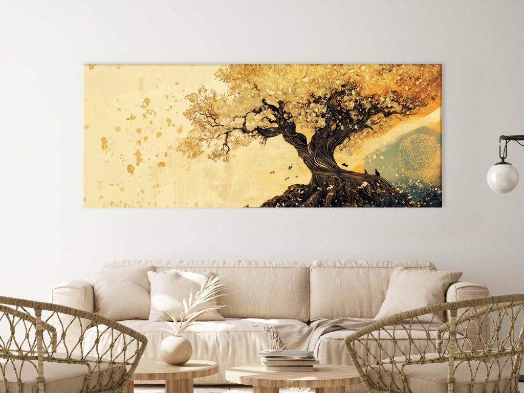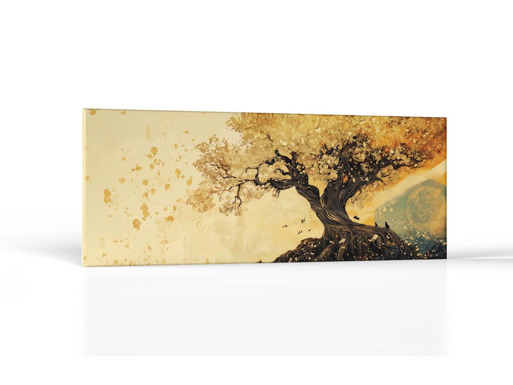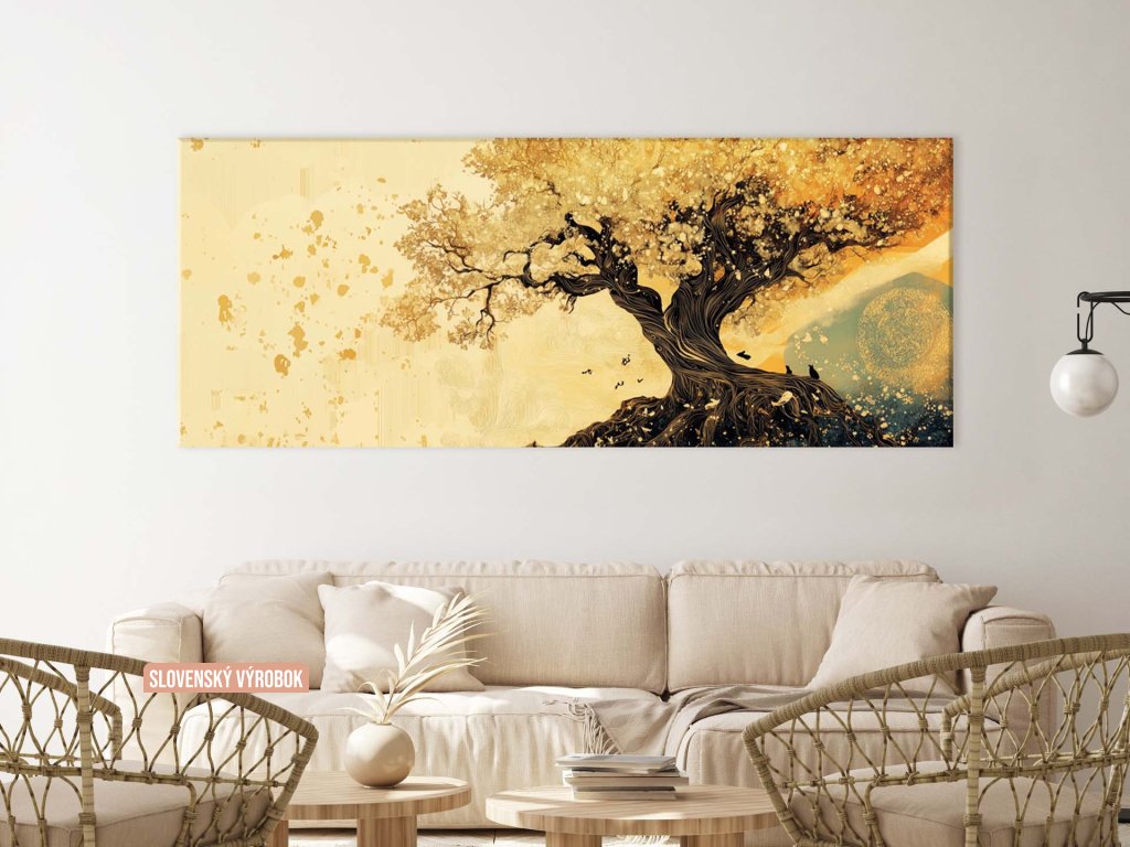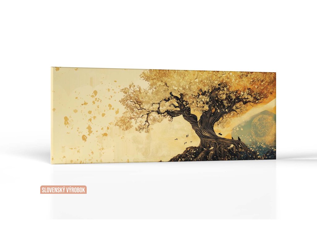 Obraz zobrazuje majestátny strom života, ktorého konáre sú zdobené zlatými listami, odrážajúcimi večný kolobeh prírody. Jemné abstraktné pozadie v zlatých a pastelových odtieňoch zdôrazňuje symboliku stromu ako zdroja vitality a harmónie. Kompozícia obrazu evokuje pocity pokoja, hlbokej prepojenosti s prírodou a duchovného vzostupu.