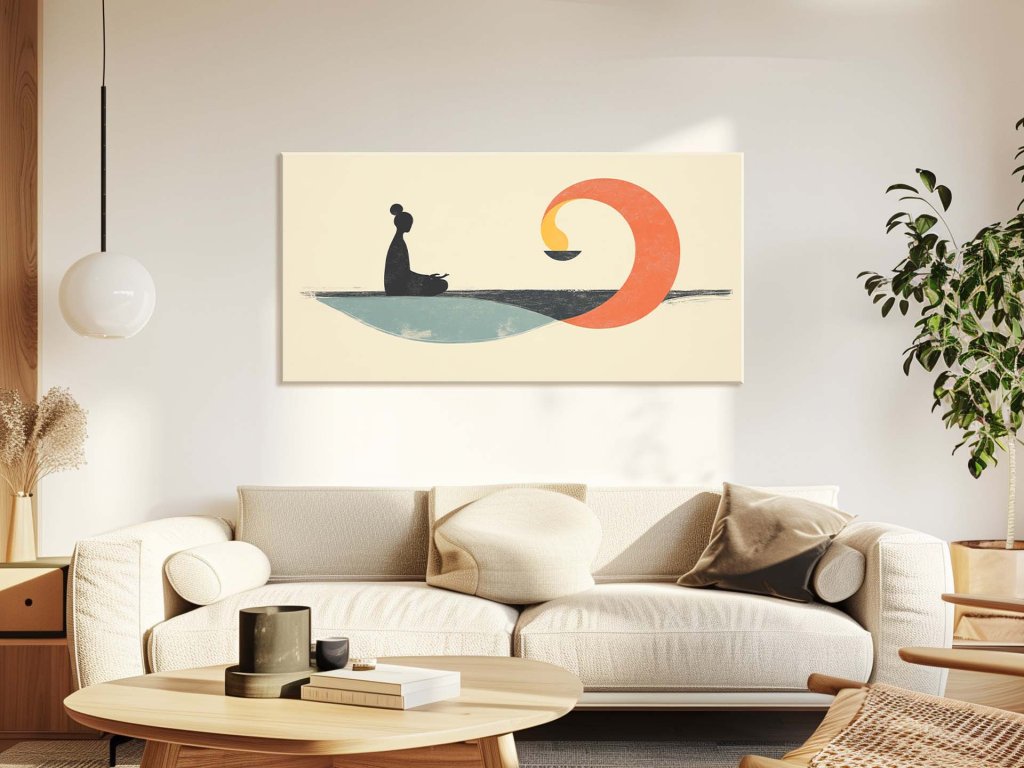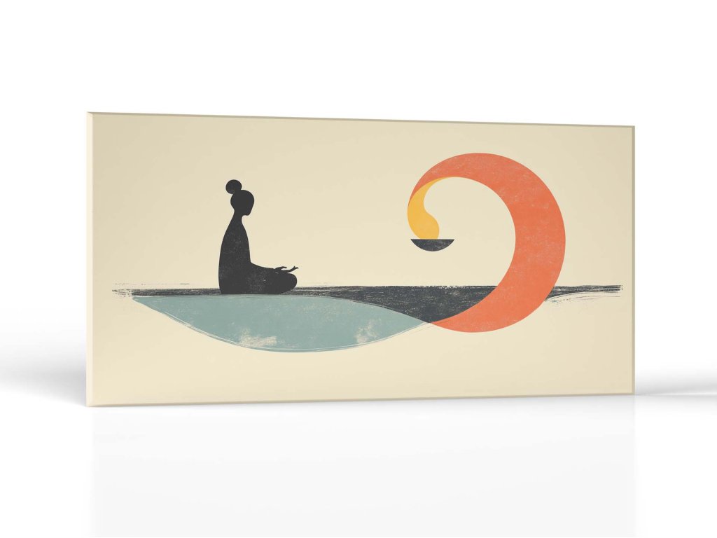 Na obraze je zobrazená silueta meditujúcej osoby, ktorá sedí na pokojnej hladine a pozoruje plameň v tvare polkruhu. Plameň predstavuje vnútornú silu a harmóniu, ktorú dosahuje človek v hlbokej meditácii. Tento obraz zdôrazňuje súlad medzi mysľou a energiou, spájajúc meditáciu s jemným svetlom vnútorného pokoja.