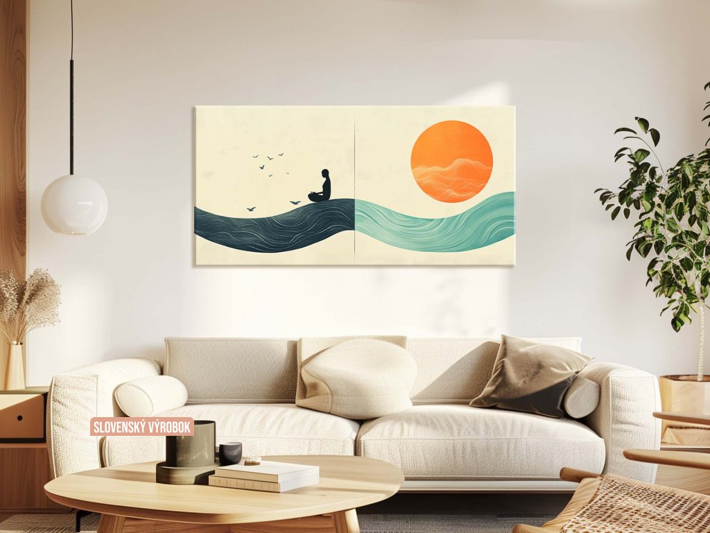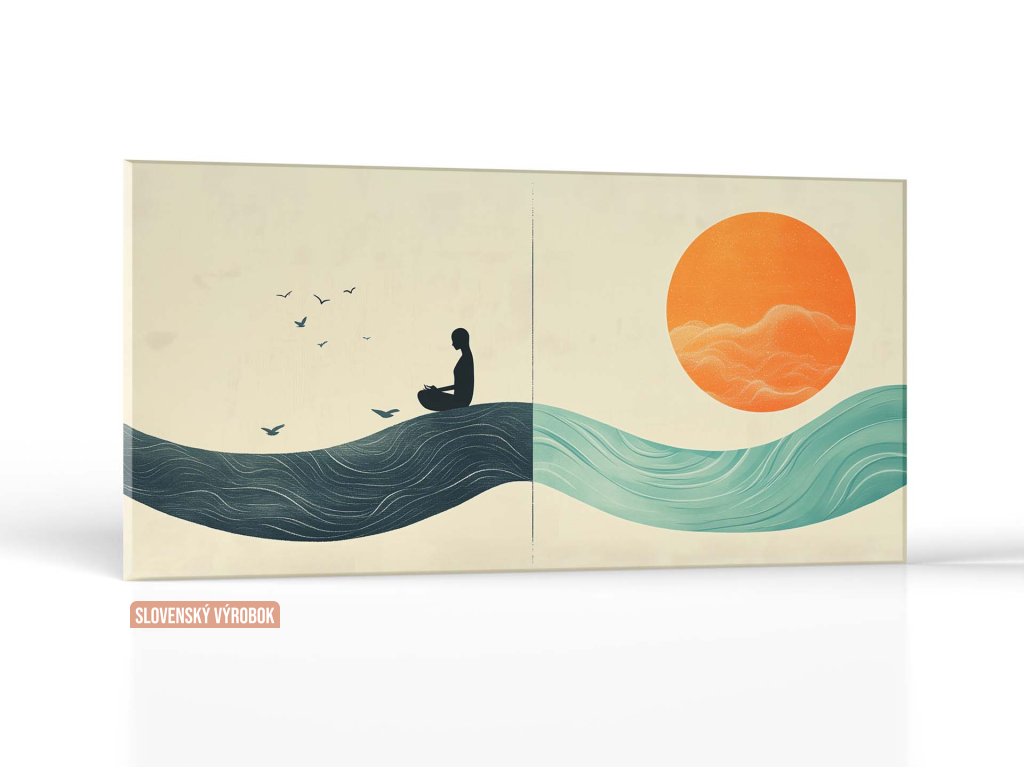 Obraz zobrazuje siluetu meditujúcej osoby sediacej na vlne, obklopenú vtákmi, čo symbolizuje pokoj a slobodu mysle. Na druhej strane je veľké oranžové slnko, ktoré vyžaruje teplo a harmóniu, zatiaľ čo vlny znázorňujú prúdenie života. Tento minimalistický a symbolický obraz vyjadruje spojenie medzi človekom, prírodou a energiou vesmíru, podporujúci rovnováhu a vnútorný pokoj.