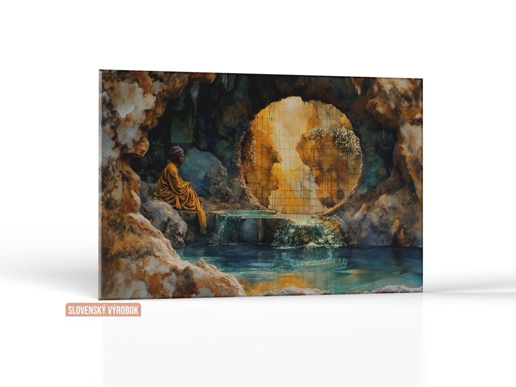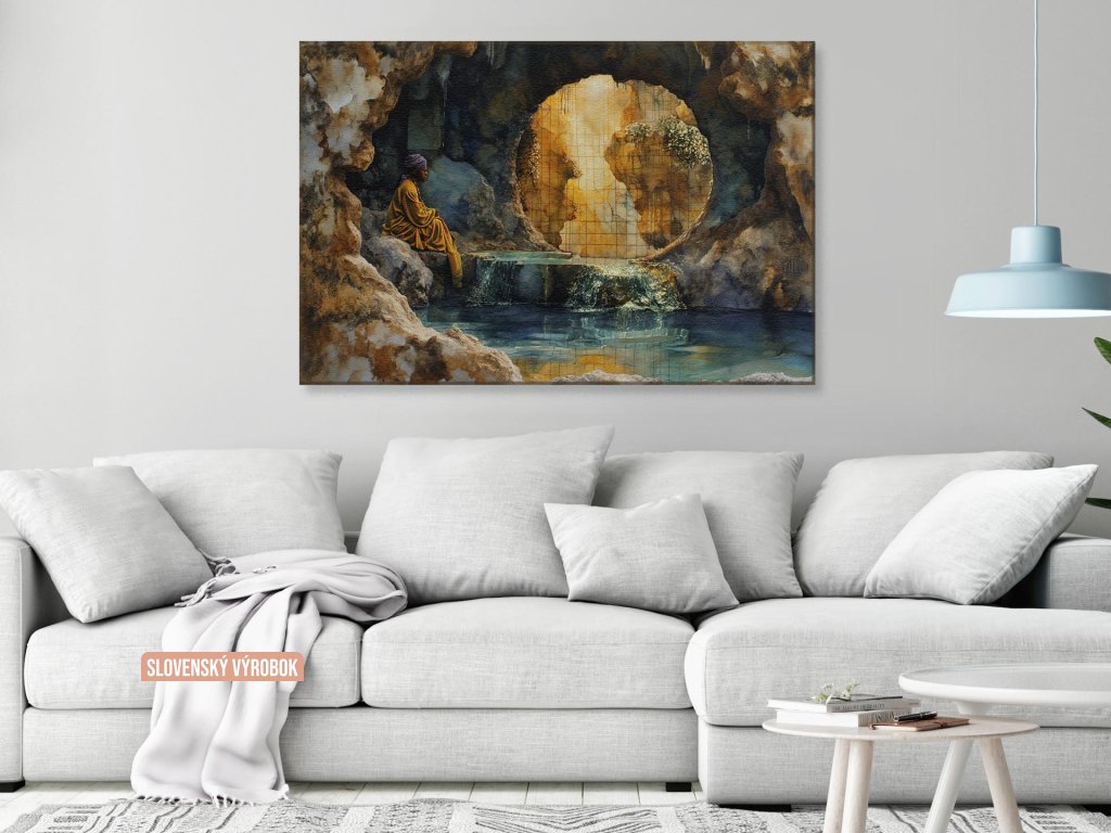 Na obraze je zobrazený pokojný okamih, kde osoba v tradičnom oblečení sedí v jaskyni s nohami prekríženými a tvárou obrátenou k vodnej ploche, ktorá odráža svetlo z otvoru v jaskyni v tvare kruhu. Scéna je naplnená pokojom a tichom, zatiaľ čo prírodné prvky ako skaly, voda a svetlo vytvárajú atmosféru hlbokého uvažovania a vnútorného pokoja.