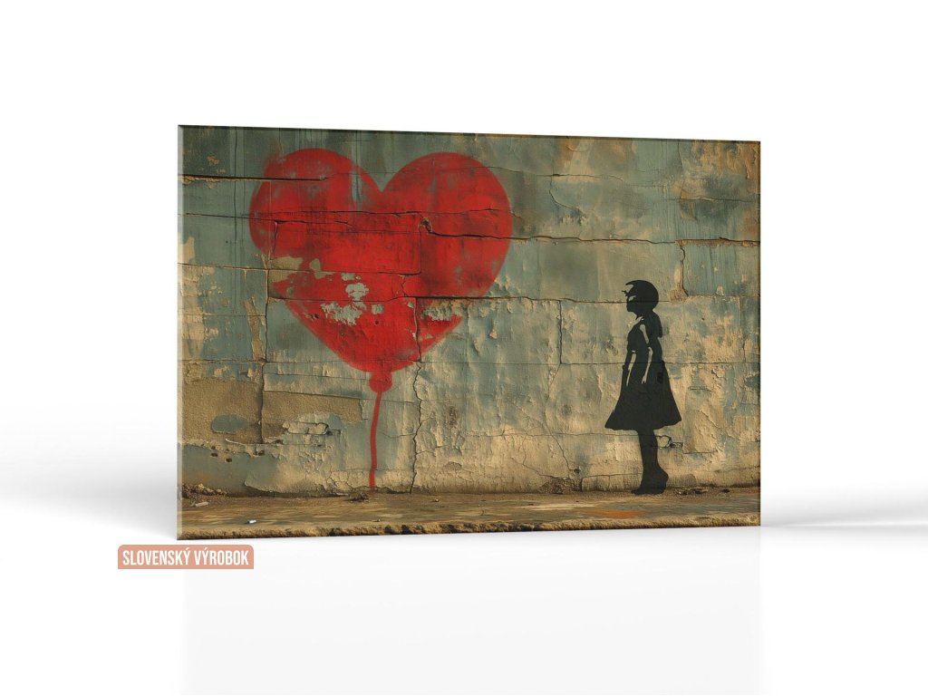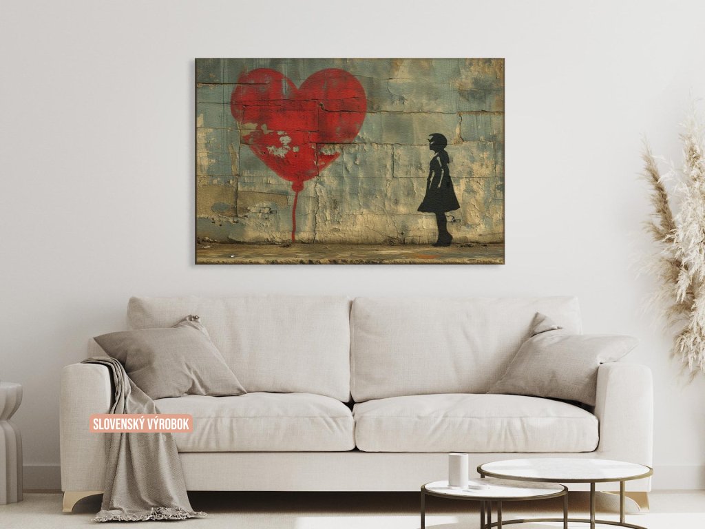 Umelecké dielo na stene zobrazuje obrovské červené srdce, z ktorého kvapká farba, a oproti nemu stojí tmavá silueta dievčaťa s klobúkom, ktoré je otočené smerom k srdcu. Stena s prasklinami a odlupujúcou sa farbou vytvára dojem starnutia a rozprávkovosti, zatiaľ čo kontrast medzi živou červenou a tmavou siluetou vytvára dramatický vizuálny efekt.