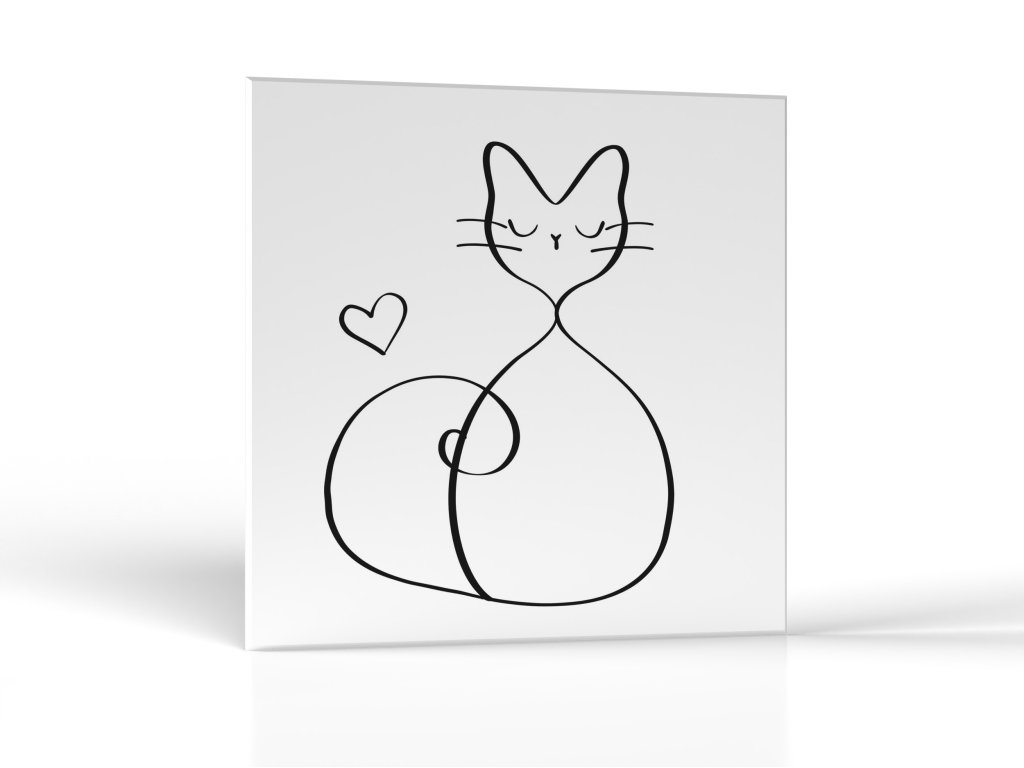 Tento obrázok predstavuje minimalisticky nakreslenú mačku, ktorá sedí s očami zatvorenými v pokojnom vyjadrení. Mačka je zobrazená čiernymi obrysovými čiarami na bielom pozadí. Nad jej chvostom je malé srdce, ktoré symbolizuje lásku a mier. Celkový dojem je čistý a jednoduchý, ideálny pre milovníkov umenia, ktorí uprednostňujú minimalizmus.