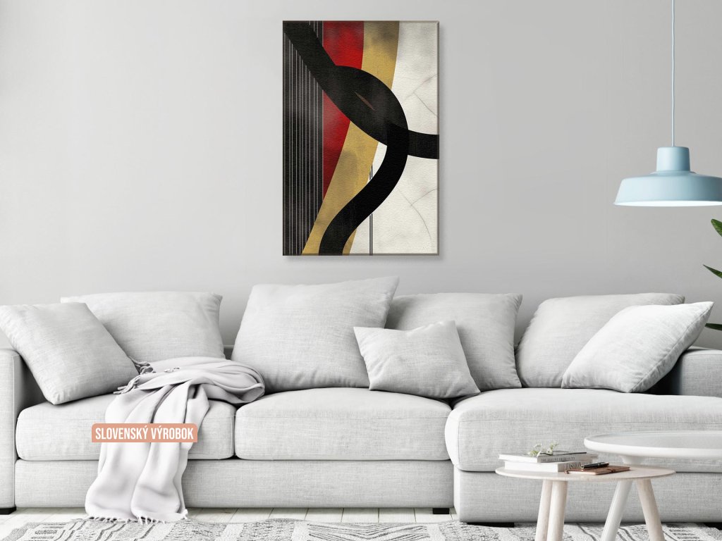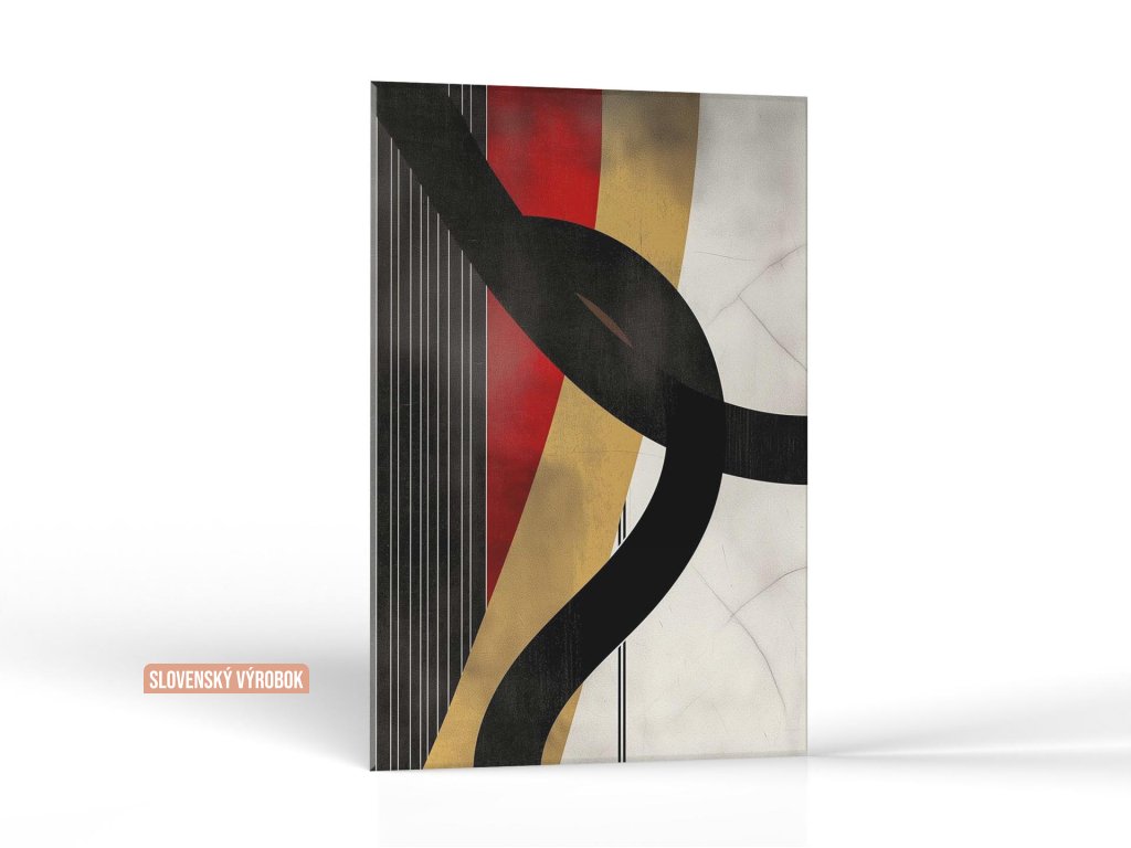 Tento obraz predstavuje modernú abstraktnú kompozíciu s dynamickými čiernymi a zlatými prvkami na pozadí s červenými a bielymi geometrickými tvarmi.