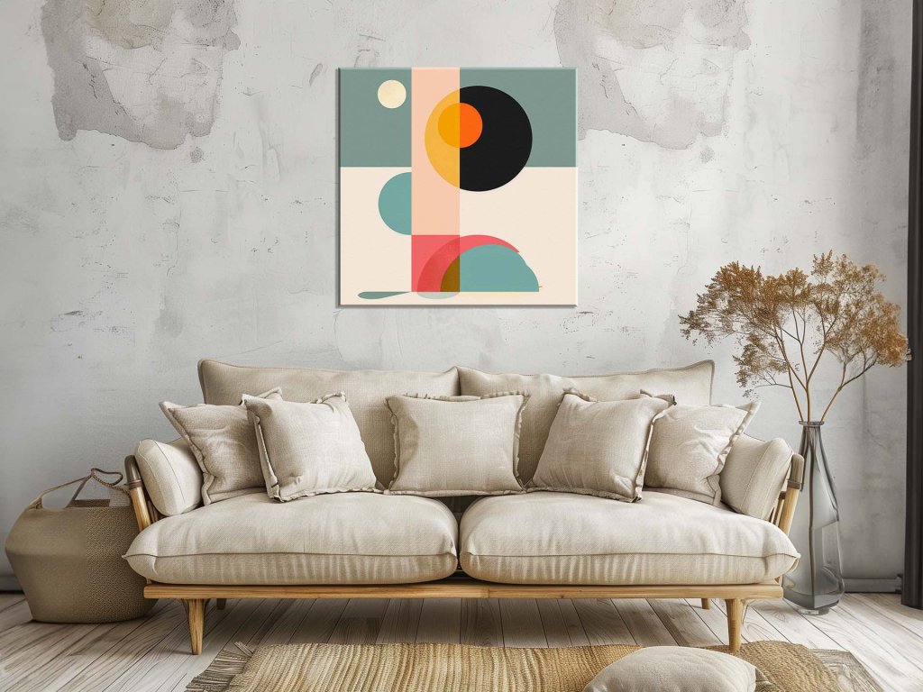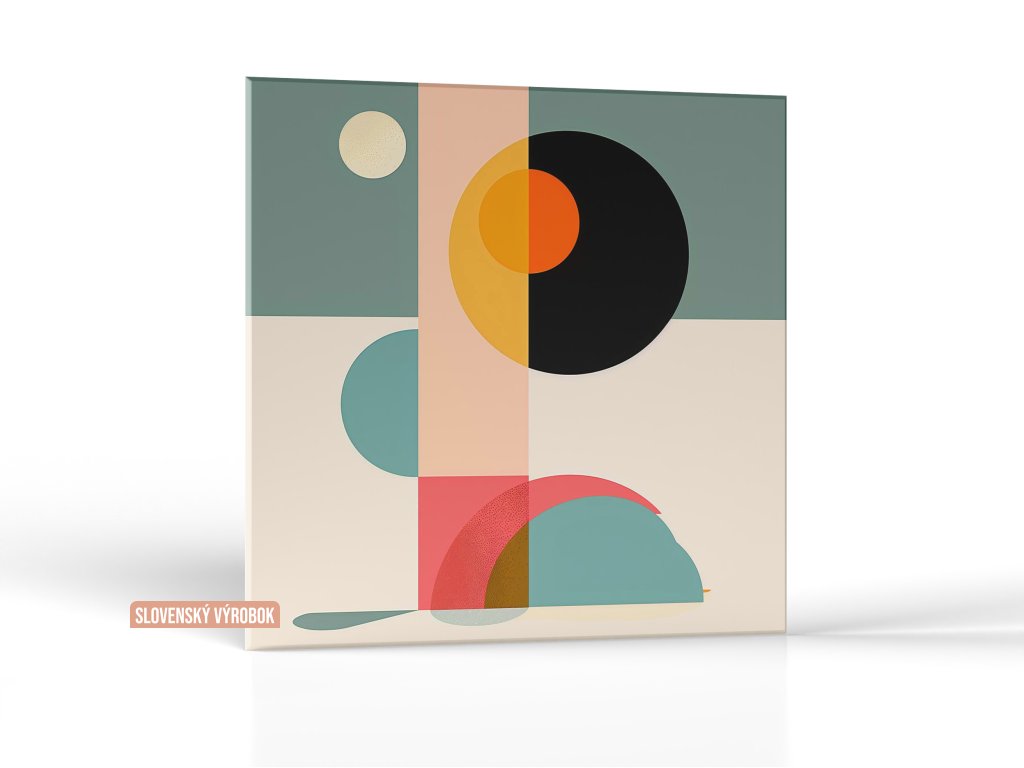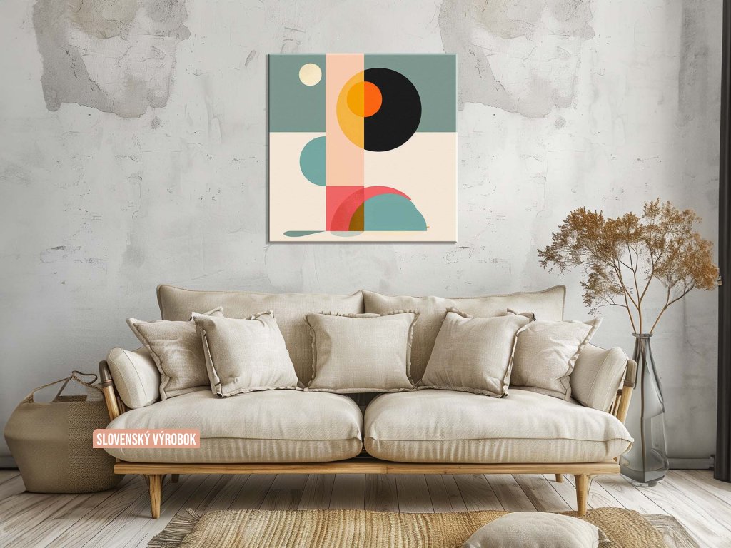 Tento umelecký obraz prezentuje rôznorodé geometrické tvary vrátane kruhov, polkruhov a pruhov, zladených v príjemných pastelových a jasných farbách. Zloženie je navrhnuté tak, aby vytváralo vizuálne pôsobivý efekt s použitím zaujímavých prekryvov a kontrastov. Jednotlivé prvky sú harmonicky usporiadané, čo vytvára esteticky vyvážený celok.