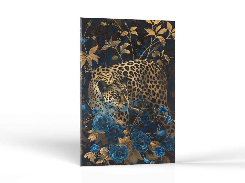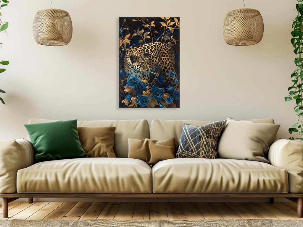 Hlboko v tmavomodrej džungli, leopard pôsobí ako majestátny strážca, s hypnotizujúcim pohľadom a elegantnou postavou. Tmavomodré kvety a zlaté listy zdôrazňujú jeho kráľovskú prítomnosť, zatiaľ čo zlaté prvky v pozadí dodávajú obrazu nádych mystiky a krásy. Obraz je vizuálne pútavý s bohatými farbami a detailnou ilustráciou.