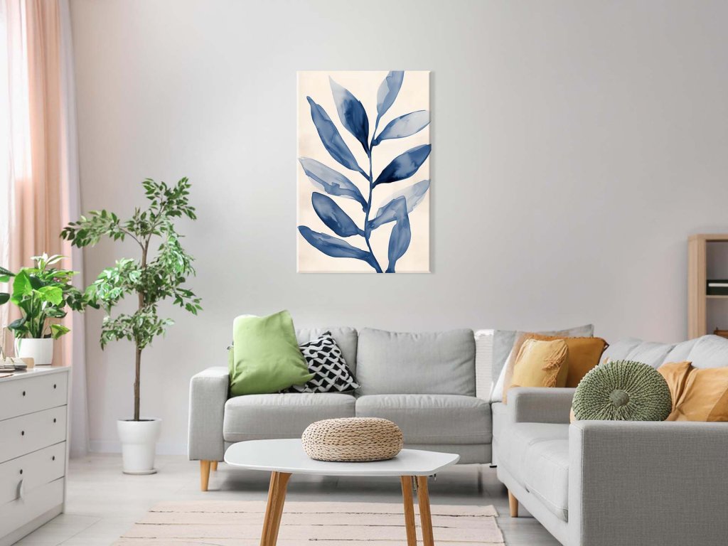 Tento obraz zobrazuje veľký modrý list na svetlom pozadí, ktorý je detailne vykreslený s jemnými prechodmi farieb. Farby a tvary listu vytvárajú dojem akvarelovej techniky, čo dodáva obrazu jemnosť a eleganciu. Kompozícia je jednoduchá, ale efektívna, vhodná pre moderný a minimalistický interiér.