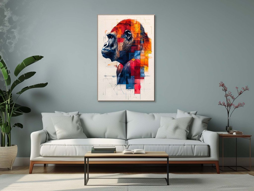 Tento obrázok zobrazuje gorilu, ktorá je vyjadrená cez dynamickú koláž geometrických tvarov a živých farieb, vrstvených tak, aby vytvorili hlboký a komplexný obraz. Tmavé obrysy tvoria zreteľný kontrast so svetlými odtieňmi a odhalujú pohľad do vnútra charakteru gorily, zatiaľ čo zlaté linky dotvárajú pocit štruktúry a poriadku v chaose farebných blokov.