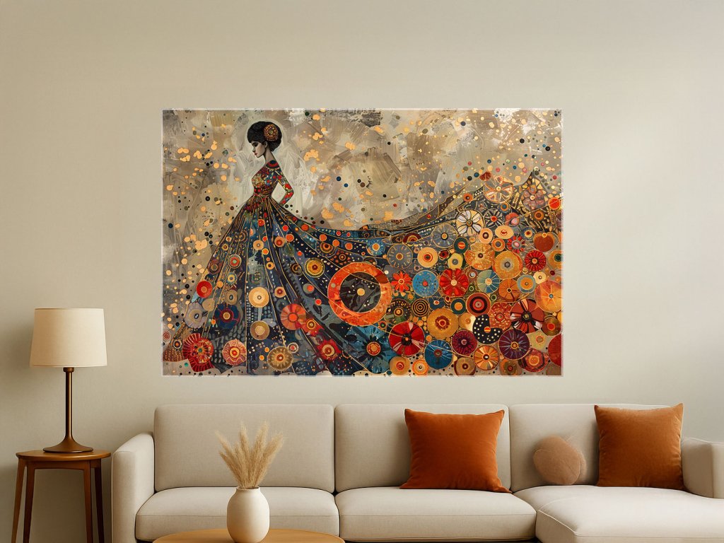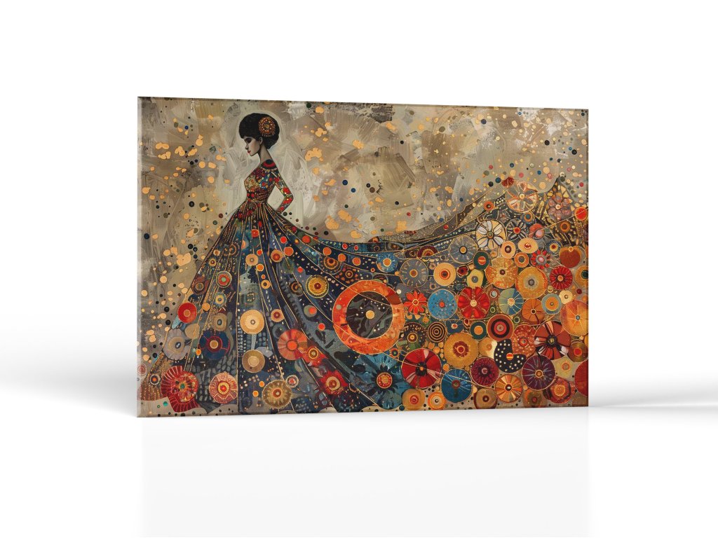 Elegantná postava ženy je zachytená vo veľkolepých tmavých šatách, ktoré sa rozlievajú do okolitého priestoru plného ornamentov a geometrických tvarov. Šaty sú zdobené množstvom kruhových motívov, ktoré evokujú dojem rôznorodých kvetov. Tento obraz kombinuje prvky tradície a modernosti, symbolizuje eleganciu a záhadnosť s abstraktným pozadím, ktoré zdôrazňuje unikátnu krásu a gráciu postavy.