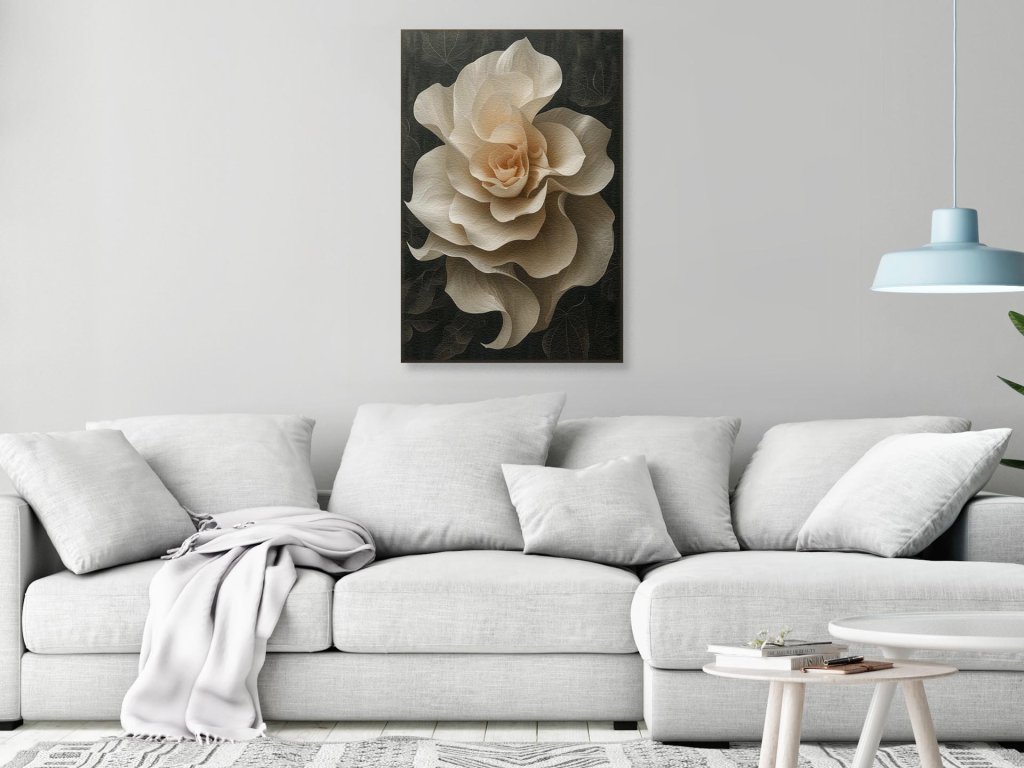 Tento obraz zachytáva abstraktný biely kvet. Plynulé krivky lupeňov vytvárajú dojem mäkkosti a hĺbky, zatiaľ čo tenké línie na pozadí pripomínajú jemnú štruktúru listov. Celková kompozícia je vyvážená a evokuje pocit elegancie a pokojnej krásy.