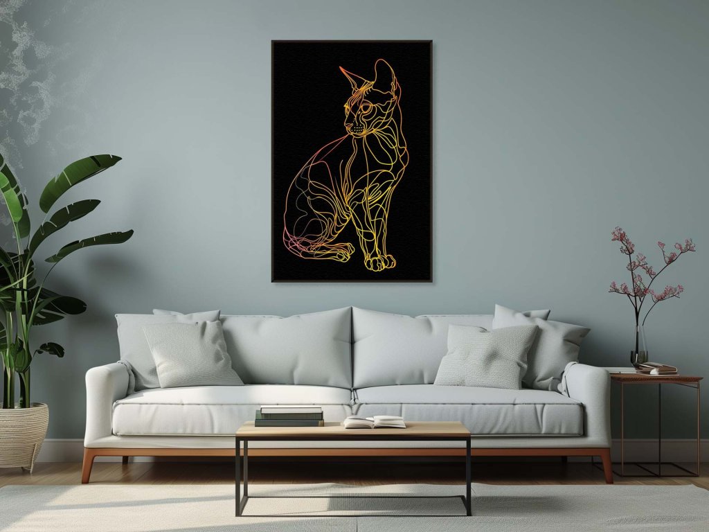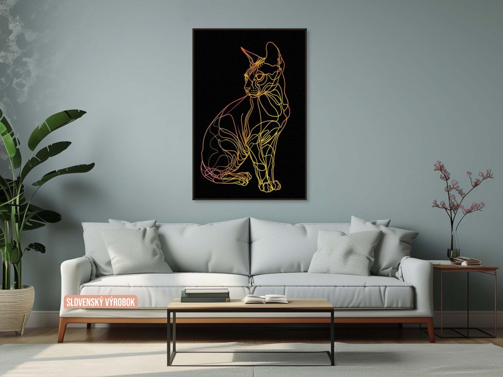 Na obraze je zobrazená štylizovaná mačka vytvorená pomocou prelínajúcich sa neonových línií, ktoré prechádzajú od teplých oranžových až po chladné žlté odtiene. Ilustrácia je minimalistickej povahy, pričom čierne pozadie umocňuje jasnosť a kontrast farieb. Dynamika a fluidita línií dodáva obrazu pocit živosti a pohybu.