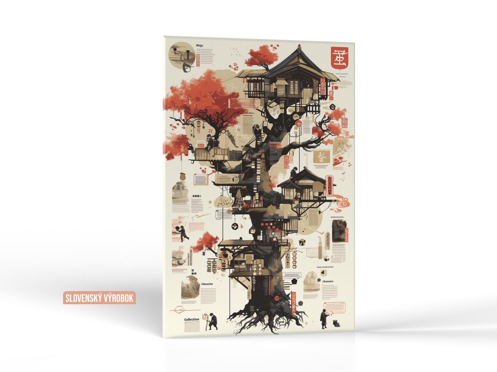 Tento obraz zobrazuje komplexnú stromovú pevnosť, ktorá slúži ako úkryt a výcvikové centrum pre ninjov. Každá úroveň stromu je vybavená rôznymi miestnosťami a zariadeniami, ktoré poskytujú všetko potrebné pre život a tréning ninjov. Detailné ilustrácie a popisky okolo stromu poskytujú pohľad do života a techník týchto tajomných bojovníkov.