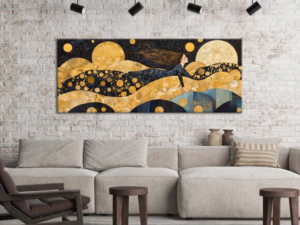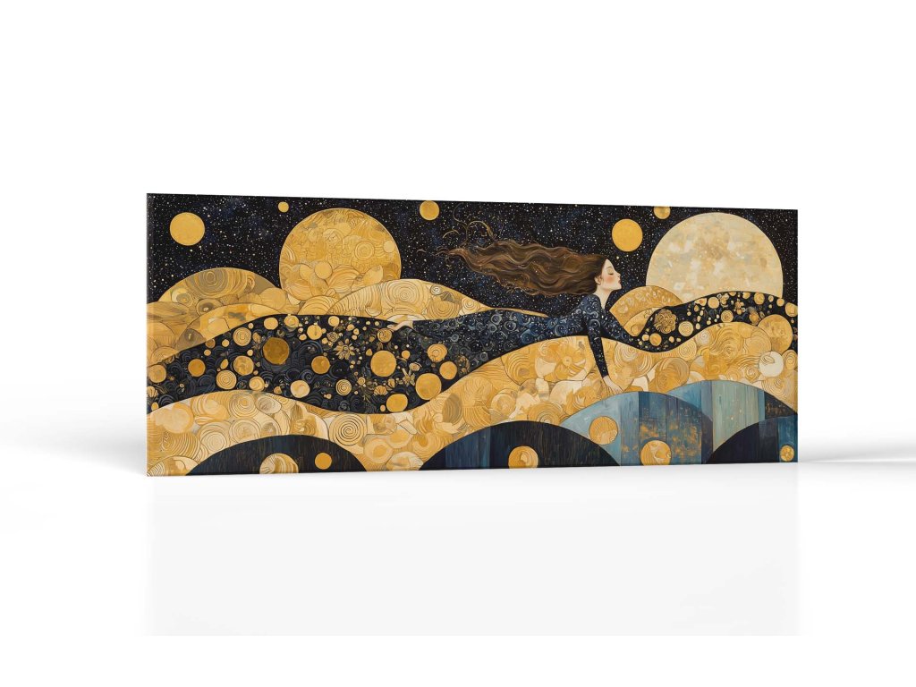 Obraz zobrazuje ženu v tmavých šatách, ktorá sa vznáša vo svetle plnom zlatých kruhov, hviezd a mesiacov. Bohatá textúra a ornamentálne detaily vytvárajú dojem mystického spojenia medzi nebom a zemou. Farebná paleta tmavých modrých tónov kontrastuje so žiarivými zlatými prvkami, čím dielo pôsobí harmonicky, magicky a fantazijne.