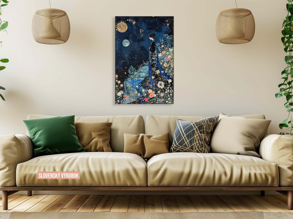 Tento obraz ukazuje elegantne oblečenú ženu stojacu uprostred nočnej scény plnej kvetov, s dvoma protichodnými mesiacmi na nebi. Výrazné kvety rôznych farieb v popredí kontrastujú s tmavým modrým a zlatým pozadím, čím vytvárajú silný vizuálny dojem. Atmosféra obrazu je naplnená pokojom a mystikou, zdôraznenou zvýraznením zlatých prvkov a lesklých bodiek na tmavom nebi.