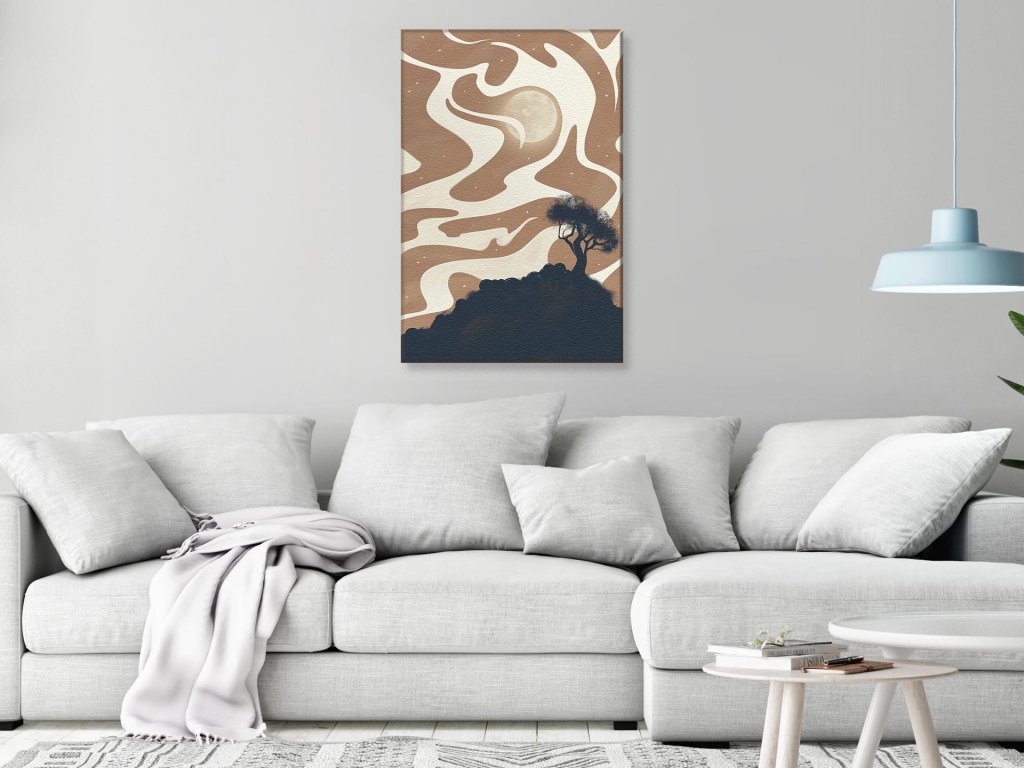 Na tomto obraze je zachytená nočná púštna scéna, kde hlavným prvkom je silueta stromu na pozadí v odtieňoch hnedej a béžovej. Strom s hustou korunou je zobrazený na vrchole malej vyvýšeniny, ktorá sa vymedzuje proti svetlejšiemu pozadiu. V pozadí je tiež zobrazený mesiac v hornej časti obrazu, čo pridáva k celkovej nočnej atmosfére. Abstraktné línie, ktoré sa vinú po celej ploche obrazu, vyvolávajú dojem piesočných dún a vlniacej sa púšte. Kombinácia farieb a tvarov vytvára pokojnú, ale zároveň dynamickú kompozíciu.