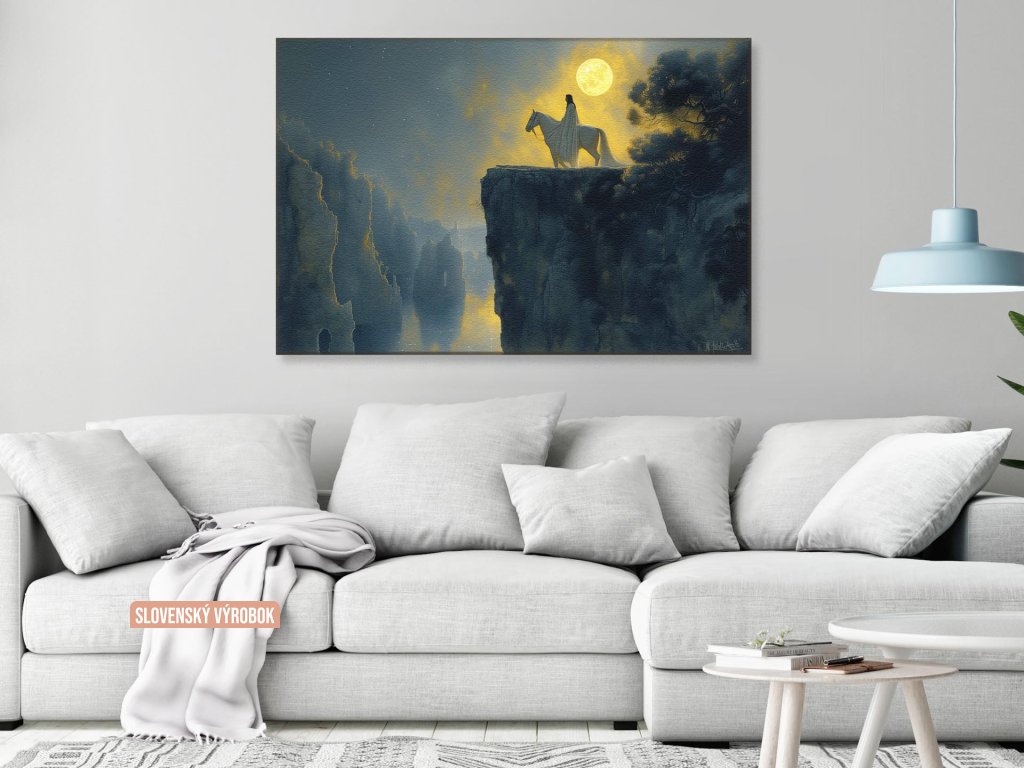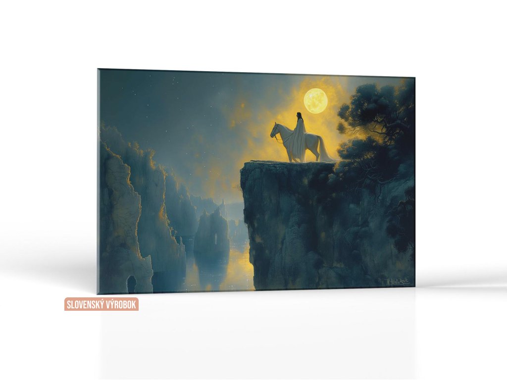 Tichá silueta postavy v dlhom plášti, ktorá sedí na vznešenom bielom koni, sa rysuje proti pozadiu pôsobivého nočného neba. Svetlý mesiac osvetľuje scénu, zatiaľ čo hlboké rokliny a tajomné vody dole dodávajú obrazu mystický rozmer. Okolité stromy a steny útesu sú ticho svedkami stojatej krásy a pokoja tejto scény.